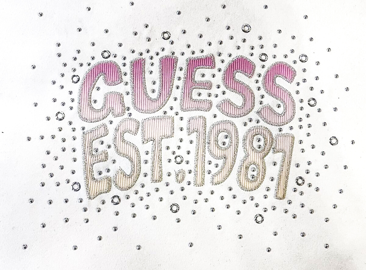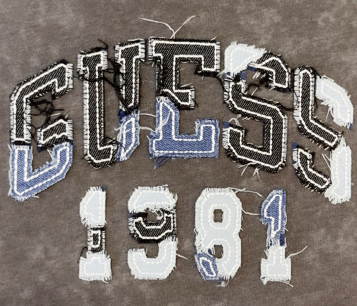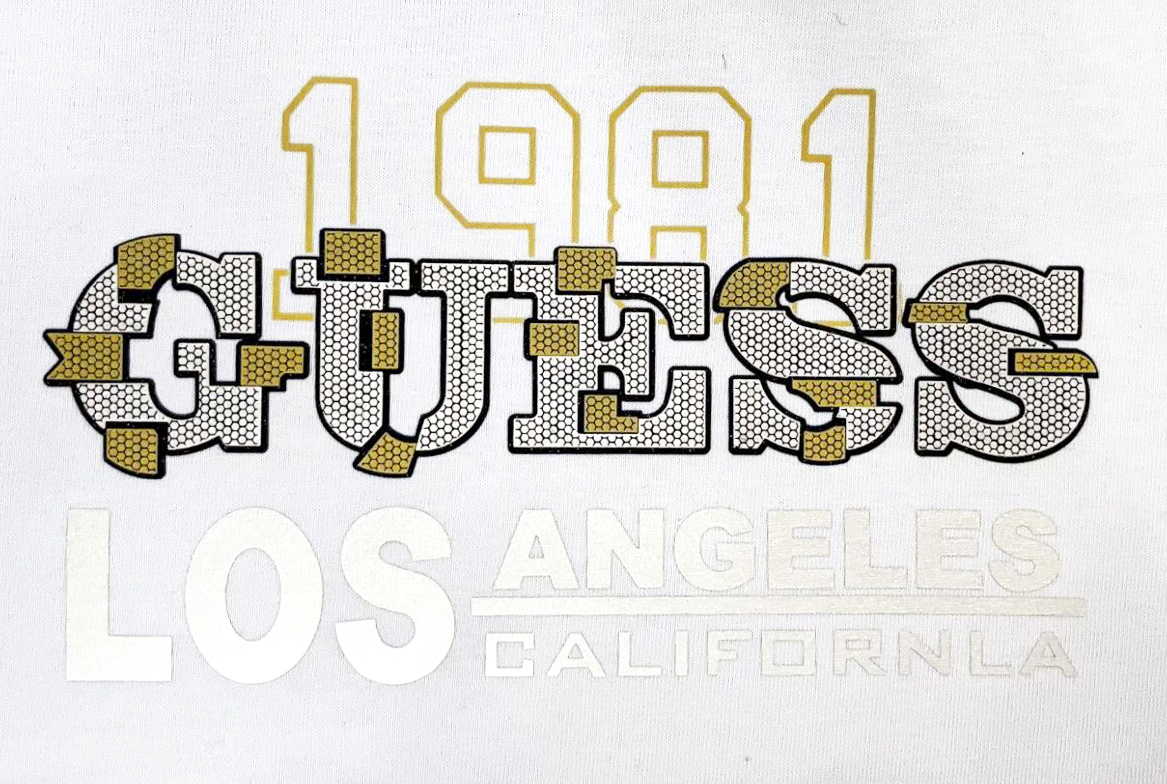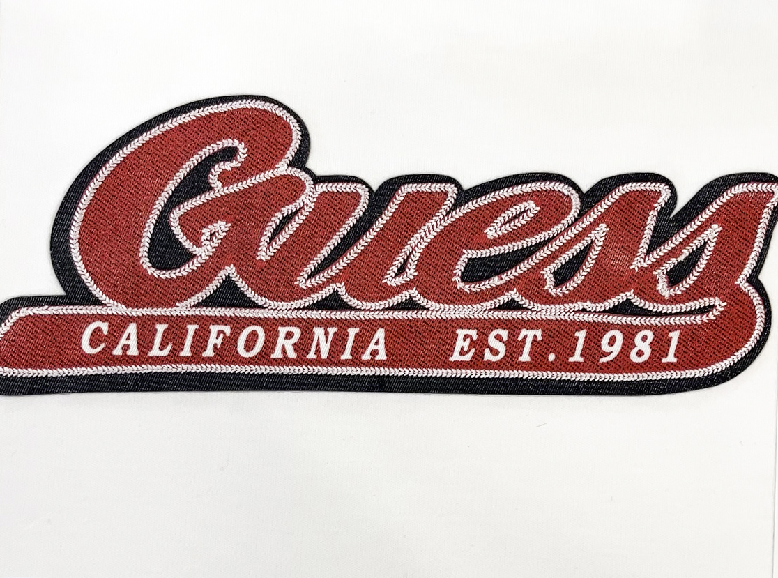 グラデーションサテンの上にパフ素材でロゴを立体化。